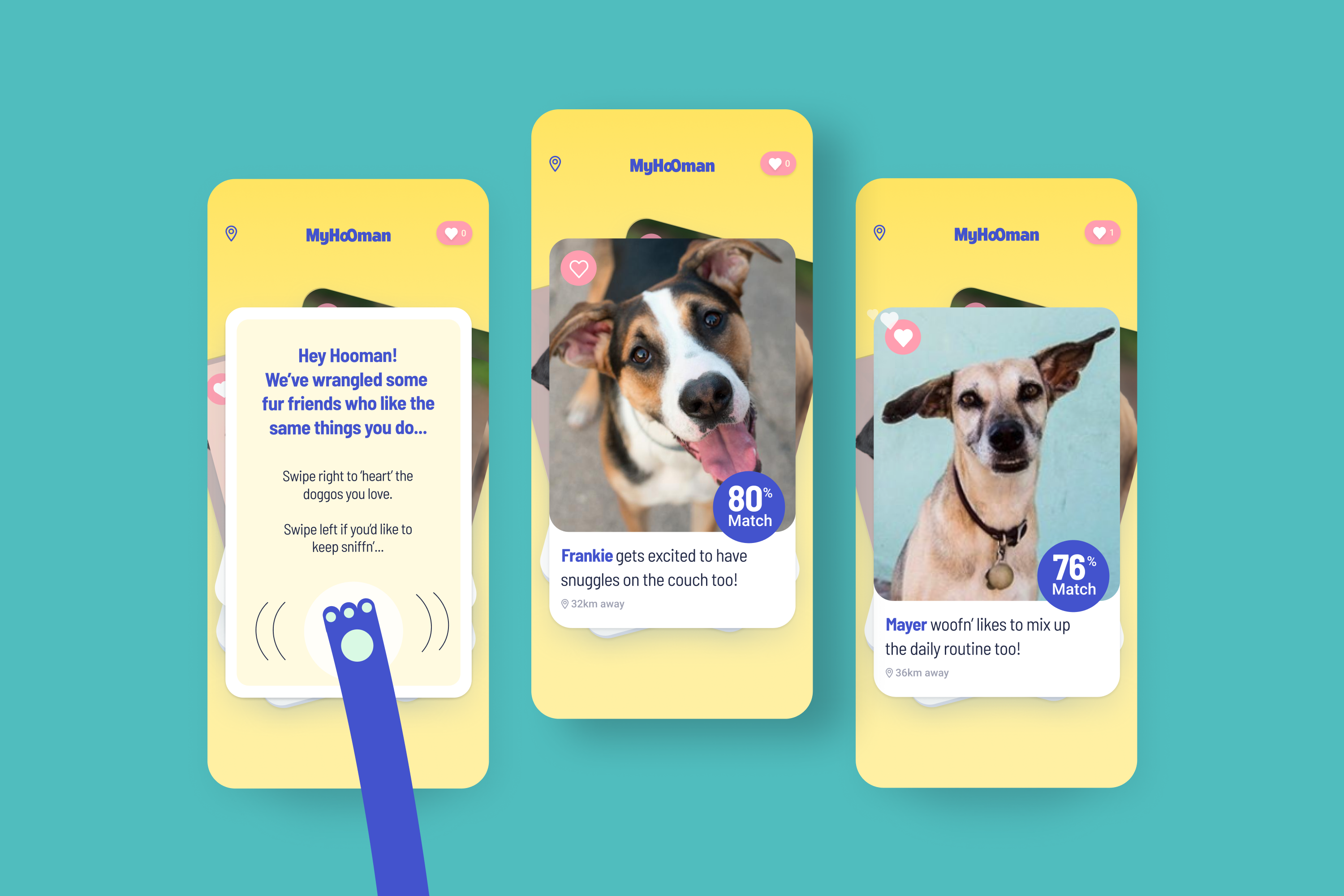 MyHooman is a digital pet adoption platform that flips the way traditional animal adoption works. It stops humans shopping for animals based on superficial reasons, and instead helps dogs find the human that’s right for their needs.