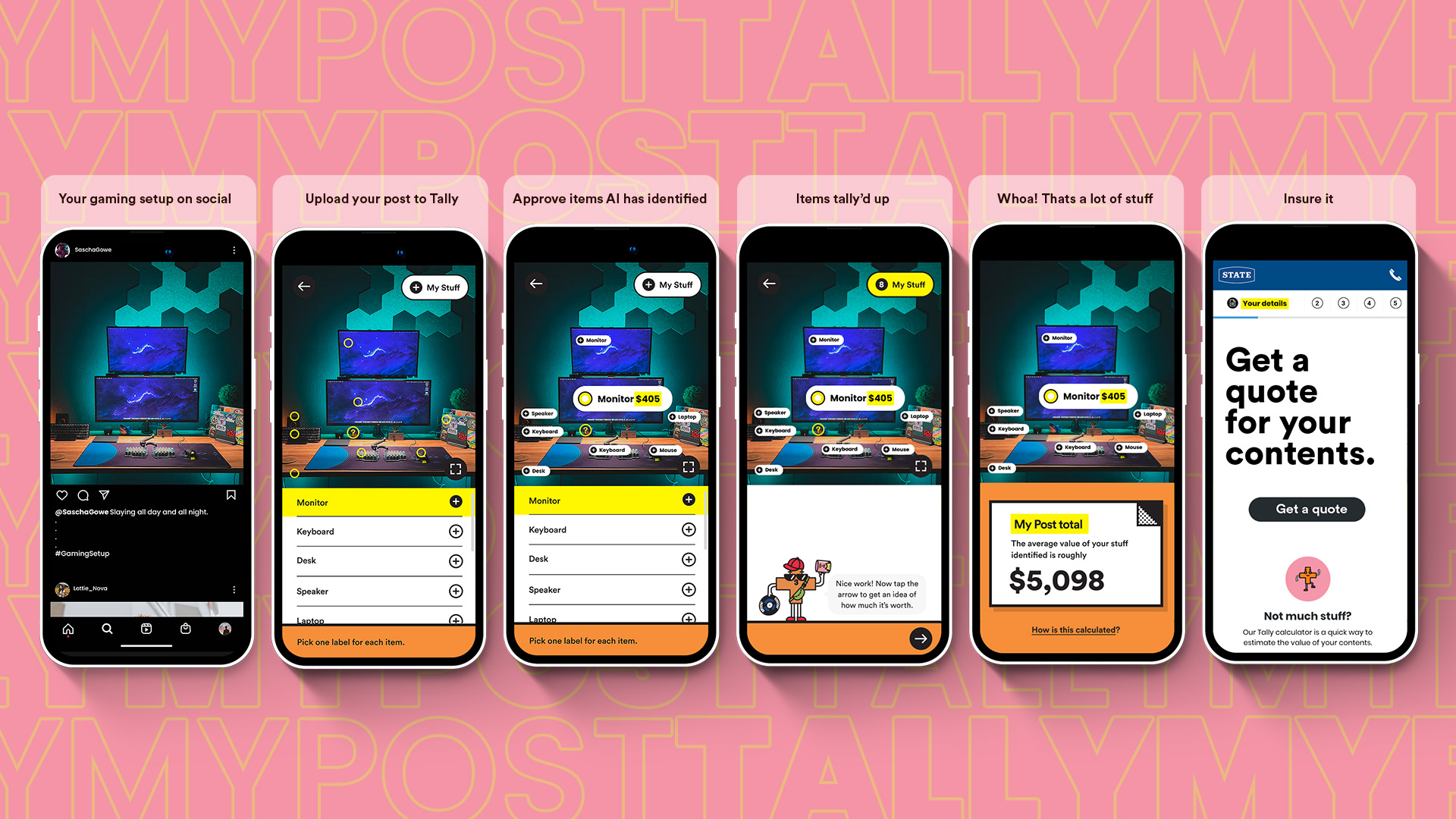 We made insuring your stuff as easy as posting about it. Tally My Post is a custom-built digital utility that uses multi-pass cloud vision machine learning technology to analyse a social post image, recognise the contents within it, cross reference those contents against claims data, and generate a super simple quote to get them insured. In other words, we built a tool that enabled people to turn their social photos into quotes.