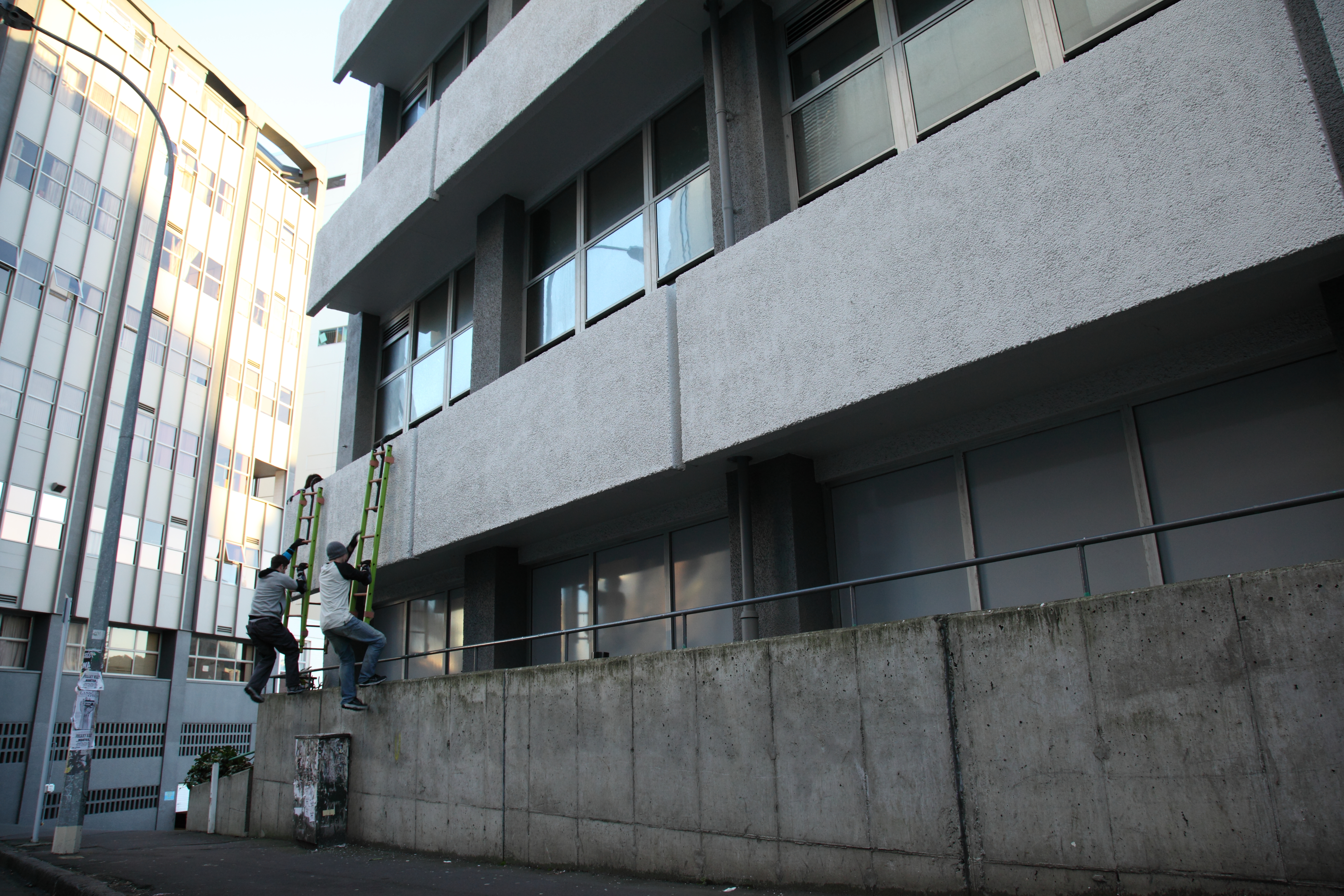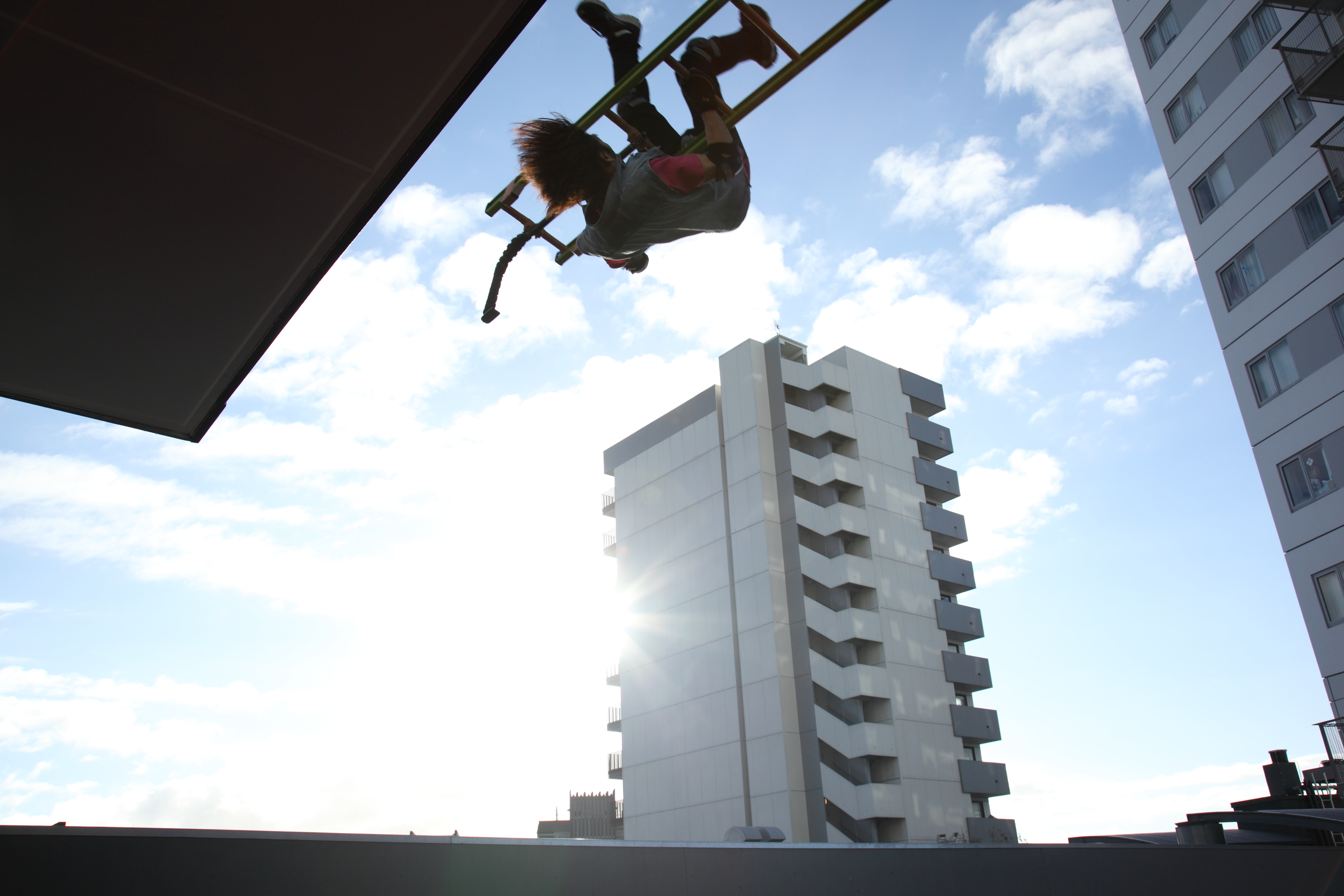 Pomparkour. Parkour with ladders. Free running on urban landscapes using a specially designed ladder to allow you to jump further and climb the faces of buildings.